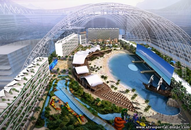 در این ساختمان عظیم، بناهای تجاری متعدد،تعدادی هتل، یک پارک آبی به نام جزیره بهشتی و یک ساحل مصنوعی قرار دارد.
